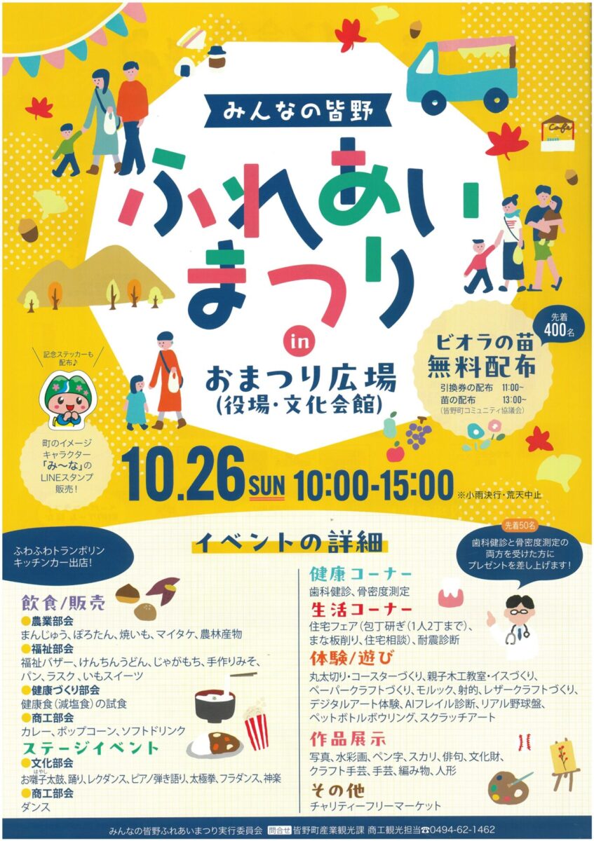 10月26日(日)に、農業・商工業・福祉・文化団体が一体となるイベント「令和7年度みんなの皆野ふれあいまつり」が、おまつり広場(役場駐車場)、文化会館を会場に開催されます!